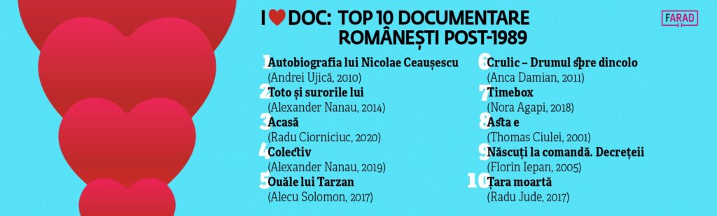 I ❤ DOC e un top subiectiv, pentru că e al comunității fARAD; dacă o altă comunitate și-ar propune un astfel de top, probabil că titlurile ar diferi pe ici pe colo, însă nu cred că în părțile esențiale. Topul de față e, de fapt, un demers necesar pentru o discuție – chiar și în contradictoriu –, într-un moment în care foarte mulți profesioniști militează pentru documentar sub acest slogan, documentarul contează. E un prilej menit să dea o importanță genului, să inițieze o conversație cu implicații sociologice și să scoată la iveală niște vârfuri. – Mihai Chirilov, consultant artistic fARAD